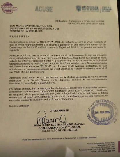 Maru Campos, la gobernadora de Chihuahua, declinó su comparecencia ante los Puntos Constitucionales y de Seguridad Pública, para evitar que se comprometa la información de carácter confidencial de las investigaciones.