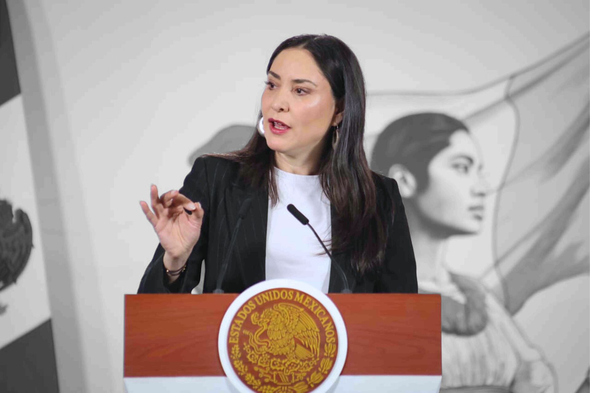 La secretaria de Cultura Claudia Curiel de Icaza durante la conferencia de prensa de la presidenta Claudia Sheinbaum en Palacio Nacional (13/02/2026). Foto: Luis Camacho / EL UNIVERSAL