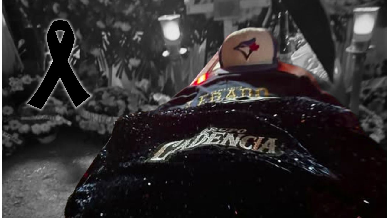 De acuerdo a la publicación emitida, nos presenta una imagen en la que se logra observar una chaqueta negra con el logo característico de la agrupación musical, acompañada de una gorra con tonos blanco y azul, ambos objetos ubicados encima de lo que parece ser un ataúd con múltiples ramos de flores, cruces y un par de veladoras detrás del mismo.
