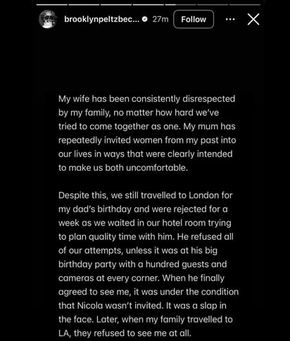 En sus mensajes, Brooklyn señaló que los problemas comenzaron incluso antes de su boda en 2022. Afirmó que su madre canceló en el último momento la confección del vestido de novia de Nicola, obligándola a buscar otro con urgencia, y que semanas antes de la ceremonia fue presionado para firmar acuerdos relacionados con el uso de su nombre, lo cual, según explicó, habría tenido consecuencias legales y financieras para él, su esposa y sus futuros hijos.