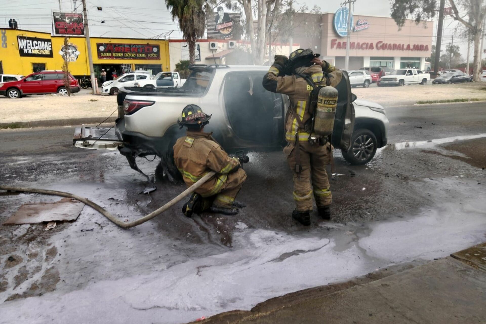 Al llegar al sitio, los rescatistas localizaron una camioneta gris, de modelo reciente, con fuego concentrado en el área del tanque de gasolina, lo que ocasionó daños en diversas piezas plásticas y en los asientos de la parte trasera del vehículo.