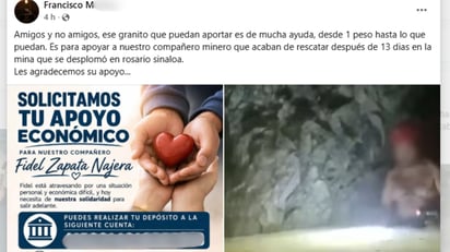 "Amigos y no amigos, ese granito que puedan aportar es de mucha ayuda, desde 1 peso hasta lo que pueda. Es para apoyar a nuestro compañero minero que acaban de rescatar después de 13 días en la mina que se desplomó en Rosario, Sinaloa. Les agradecemos su apoyo".