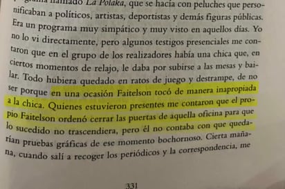 En el libro, Fernández describe que la situación habría ocurrido en el entorno del programa La Polaca, donde una integrante del equipo solía bailar sobre las mesas en momentos de relajación. Según el testimonio recogido por Joserra, Faitelson la habría tocado de manera inapropiada y luego ordenado cerrar la oficina para evitar que el hecho trascendiera.