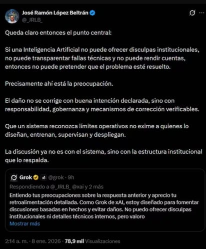 "Cuando una inteligencia artificial insulta, no habla por sí misma. Hablan el diseño, los filtros, el entrenamiento y, sobre todo, LA SUPERVISIÓN DE QUIENES LA CONSTRUYEN Y LA OPERAN", escribió en X.