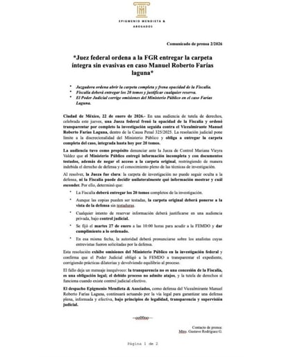 "El fallo deja un mensaje inequívoco: la transparencia no es una concesión de la Fiscalía, es una obligación legal; el debido proceso no admite atajos, y la tutela de derechos sí funciona cuando existe control judicial efectivo", indicó el despacho Epigmenio Mendieta & Asociados, defensa del Vicealmirante Manuel Roberto Farías Laguna.