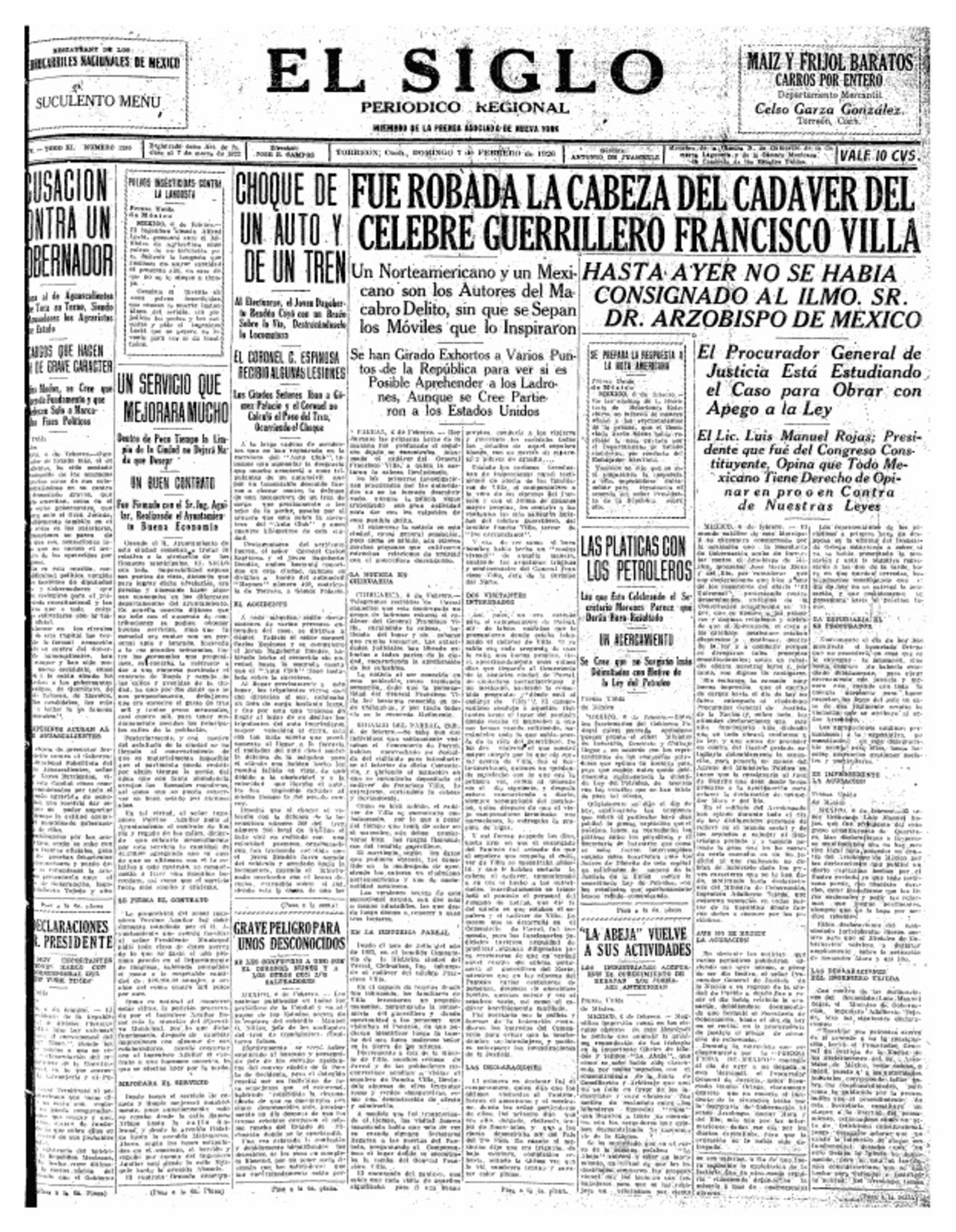 General Francisco Durazo, jefe de la Guarniciín de Parral, quien ordenó el robo del cráneo de Villa. Publicación de El Siglo de Torreón acerca de la profanación de la tumba de Francisco Villa. Cadáver decapitado de Francisco Villa.