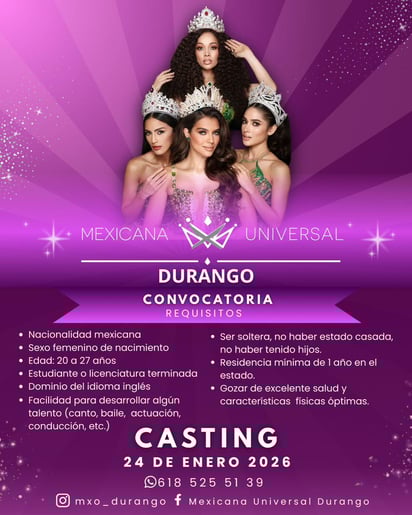 Las interesadas en participar pueden obtener más información a través de las redes sociales oficiales de Mexicana Universal Durango, donde se publicarán los detalles sobre el casting y las siguientes etapas del proceso.