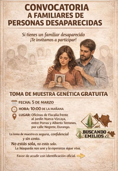 En Durango, la asociación Buscando Emilios está realizando una convocatoria en todo el estado para que las familias que tengan un familiar desaparecido o no localizado puedan acudir a una campaña gratuita de toma de muestras genéticas.