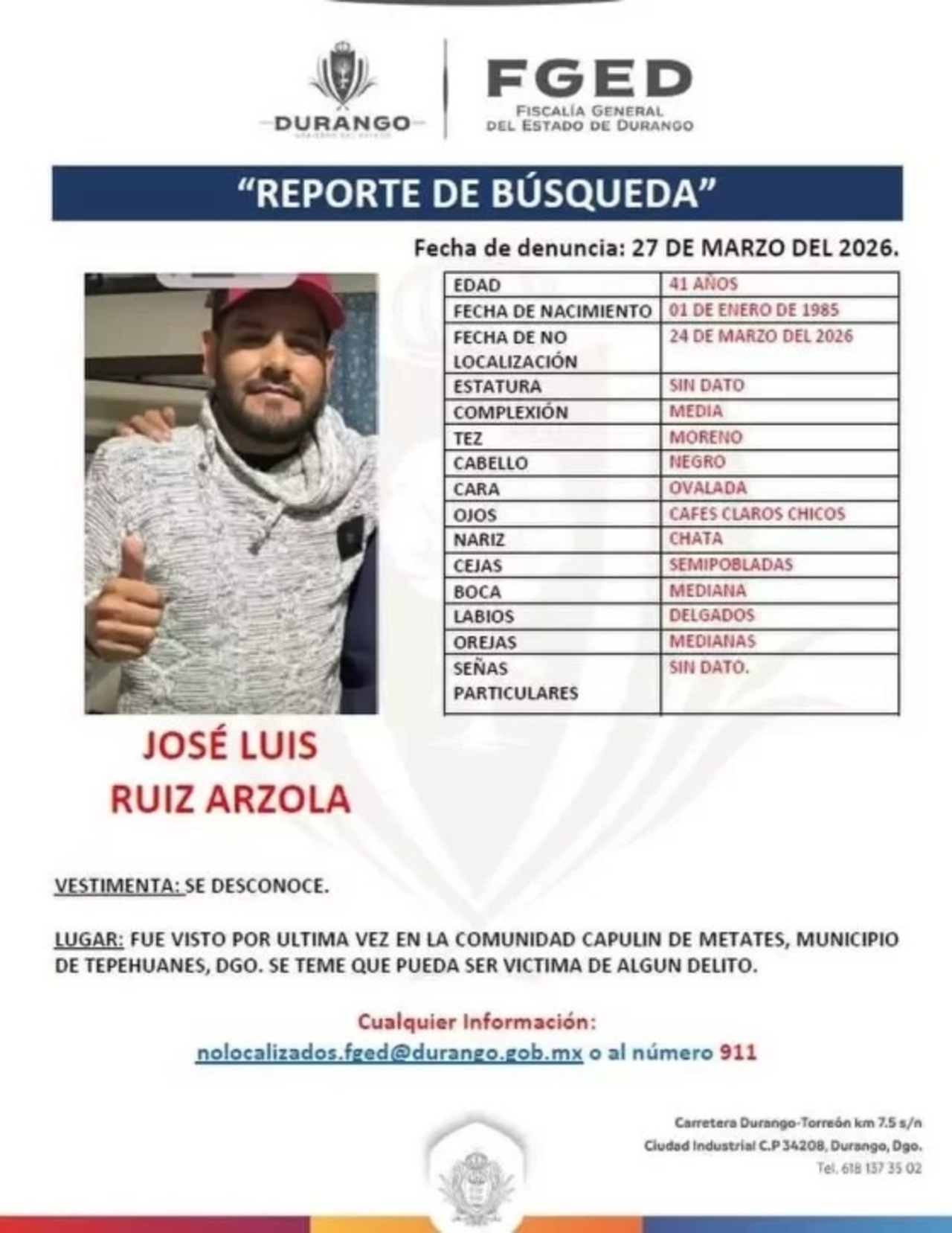 Se trata de José Luis Ruiz Arzola, de 41 años de edad, quien había sido reportado como no localizado desde el pasado 24 de marzo, luego de ser visto por última vez en la comunidad Capulines de Metates.