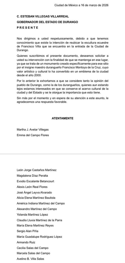 La preocupación la llevó a convocar a familiares, colegas y amigos duranguensespara elaborar una carta dirigida al gobernador Esteban Villegas Villarreal. El documento, fechado el 16 de marzo en la Ciudad de México, solicita que la escultura permanezca en su ubicación actual y subraya su valor artístico, histórico y simbólico. “Se trata de un monumento creado específicamente para ese sitio”, señala la misiva, que también pide considerar la opinión de la ciudadanía y del propio INAH, al tratarse de una pieza con relevancia patrimonial.