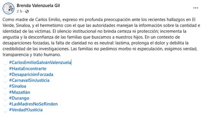 "Como madre de Carlos Emilio, expreso mi profunda preocupación ante los recientes hallazgos en El Verde, Sinaloa, y el hermetismo con el que las autoridades manejan la información sobre la cantidad e identidad de las víctimas.