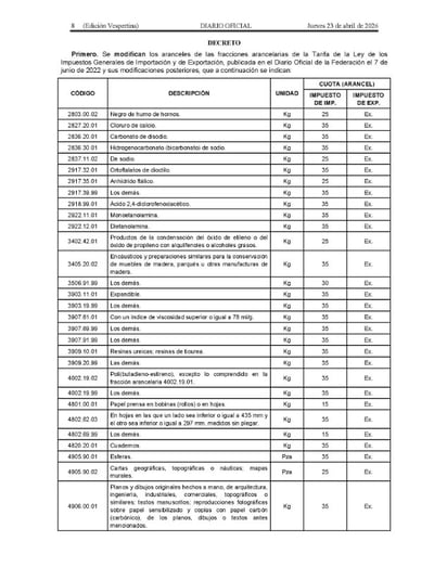 El cambio forma parte de una modificación a la Tarifa de la Ley de los Impuestos Generales de Importación y de Exportación, publicada el 23 de abril de 2026 en el Diario Oficial de la Federación. La medida contempla ajustes arancelarios para determinadas fracciones de productos importados.