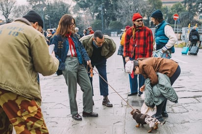 El street style de Pitti Uomo Otoño-Invierno 2026 también destaca por la presencia de perritos chic acompañando a los asistentes, un guiño simpático que subraya cómo el estilo trasciende la ropa para convertirse en una experiencia visual completa.