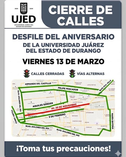 Este viernes 13 de marzo, se llevará a cabo en la ciudad de Durango el desfile por el aniversario de la Universidad Juárez del Estado de Durango (UJED), por lo que se prevé el cierre de algunas calles en la Zona Centro de la capital.