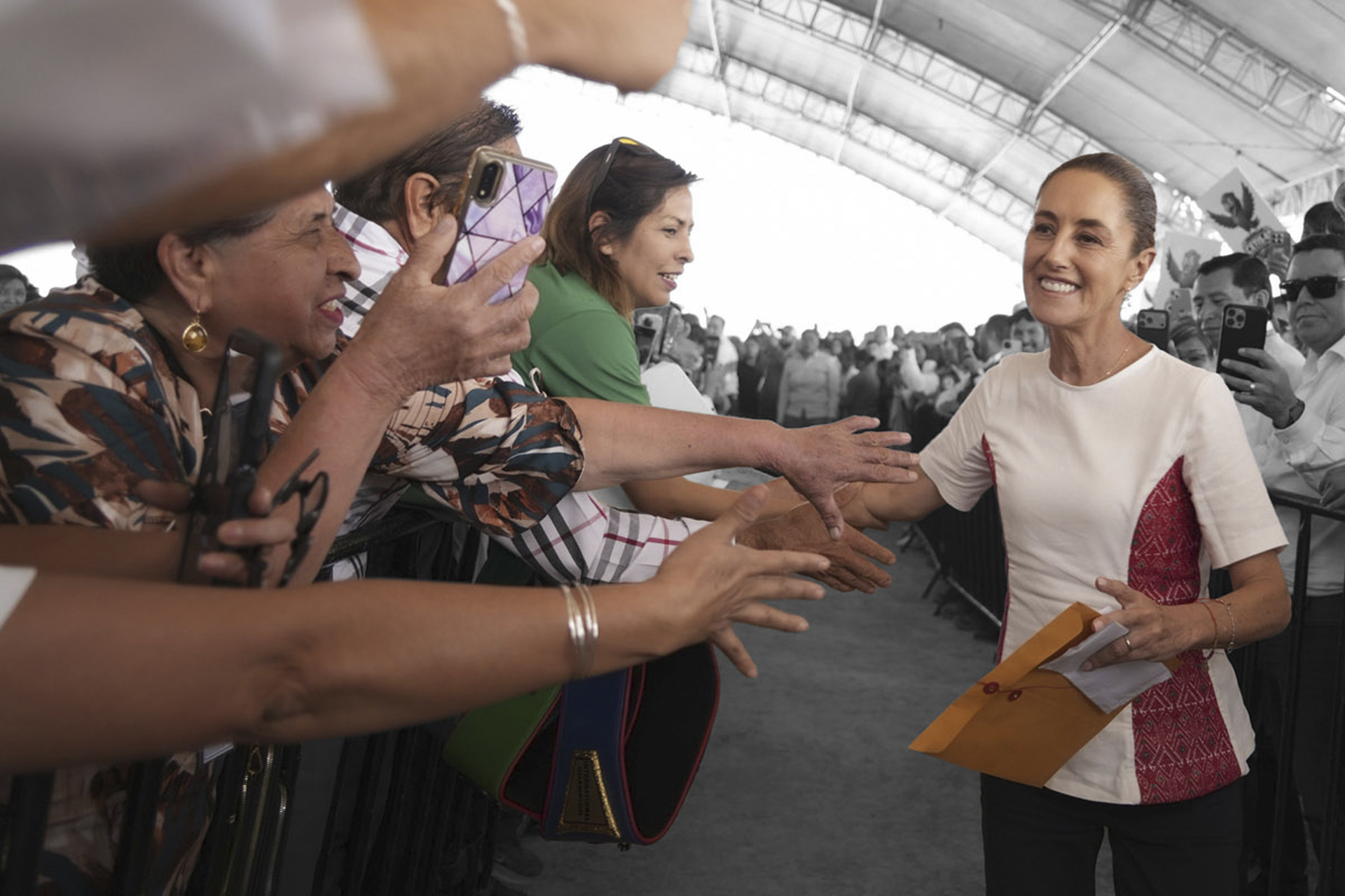 Mientras se llevaba a cabo el evento Arranque de Obra del Hospital Regional de Especialidades del IMSS, la presidenta Claudia Sheinbaum Pardo bajó del templete para atender a un grupo de personas buscadoras que con gritos, megáfono y pancartas llamaron su atención.