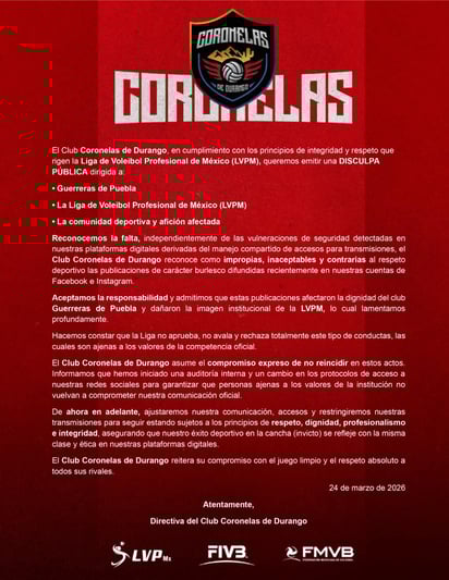 En su comunicado oficial emitido este 24 de marzo, Coronelas de Durango reconoció que las publicaciones fueron “impropias, inaceptables y contrarias al respeto deportivo”, señalando además que se detectaron vulneraciones de seguridad en sus plataformas digitales derivadas del manejo compartido de accesos.