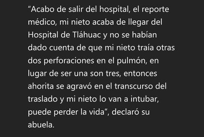 Según reportes de las últimas horas, el menor se agravó, pues al principio se le atendió en el Hospital General de Tláhuac, para luego ser trasladado al Hospital Pediátrico de Legaria, donde se le detectaron nuevas perforaciones en uno de sus pulmones.