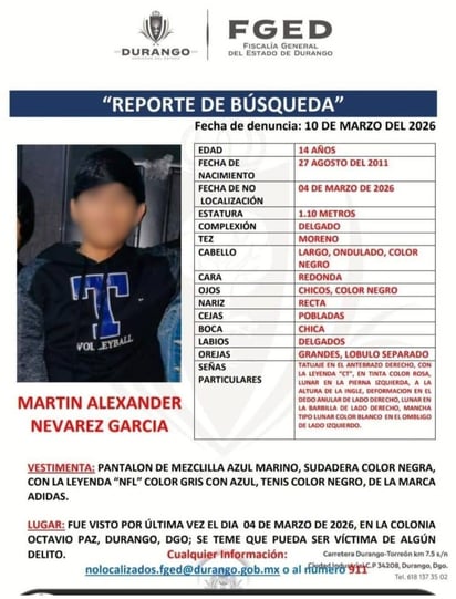 De acuerdo a su ficha, desapareció el pasado 4 de marzo en la colonia Octavio Paz, en Durango capital. Ese día portaba un pantalón de mezclilla azul marino, sudadera color negra con la leyenda "NFL" color gris con azul, tenis color negro de la marca Adidas.