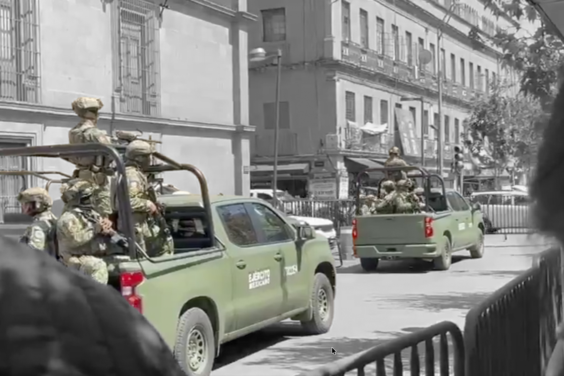 Mientras al interior del recinto se desarrollaba el encuentro, en el exterior la escena era distinta: elementos de la Secretaría de la Defensa Nacional resguardando la calle Corregidora, algunos de ellos con armas largas y equipo de artillería.