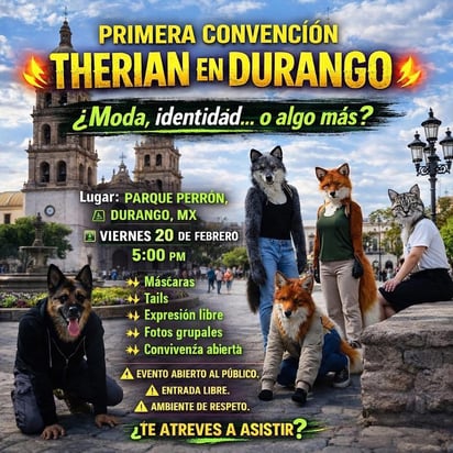 El anuncio describe el encuentro como la “Primera Convención Therian en Durango” y plantea la pregunta “¿Moda, identidad… o algo más?”, en alusión al debate que ha rodeado a este fenómeno en el país.