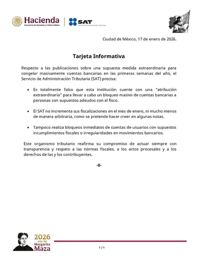 El Servicio de Administración Tributaria desmintió versiones difundidas en redes sociales y algunas publicaciones digitales que aseguraban la existencia de una supuesta medida extraordinaria para congelar masivamente cuentas bancarias durante las primeras semanas del año.