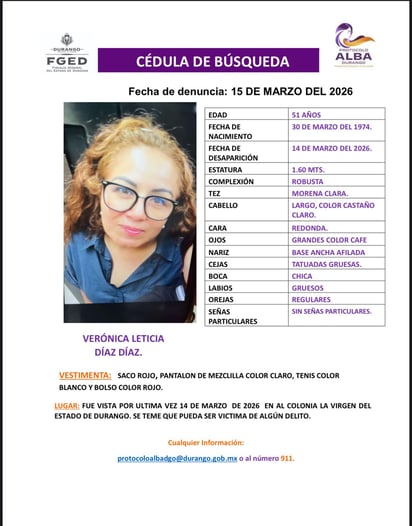 Fue vista por última vez el 14 de marzo en la colonia La Virgen de la ciudad de Durango.