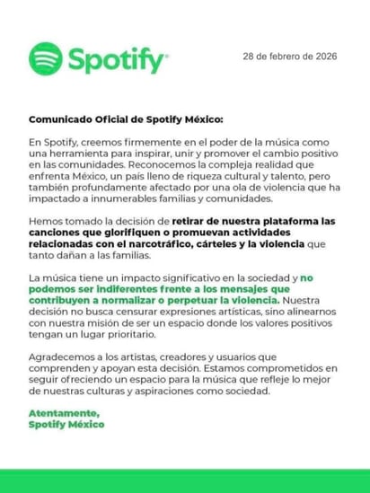 En redes volvió a circular un supuesto “Comunicado Oficial de Spotify México”, fechado el 28 de febrero de 2026, donde se afirma que la plataforma retirará de su catálogo canciones que “glorifiquen o promuevan” actividades relacionadas con el narcotráfico, los cárteles y la violencia. La imagen se está compartiendo como si fuera un anuncio definitivo y, en cuestión de horas, reactivó el debate: ¿se trata de una medida contra la narcocultura o de un intento de censura?