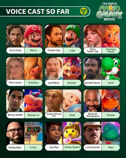El elenco de voces también conserva a sus protagonistas: Chris Pratt como Mario, Anya Taylor-Joy como Peach, Charlie Day como Luigi, Jack Black como Bowser y Keegan-Michael Key como Toad. A ellos se suman nuevas incorporaciones como Brie Larson, quien interpreta a Rosalina, Donald Glover, que da voz a Yoshi, Issa Rae, en el papel de Honey Queen, y Luis Guzmán, quien interpreta a Wart, ampliando el rango interpretativo y fortaleciendo el atractivo comercial del proyecto.