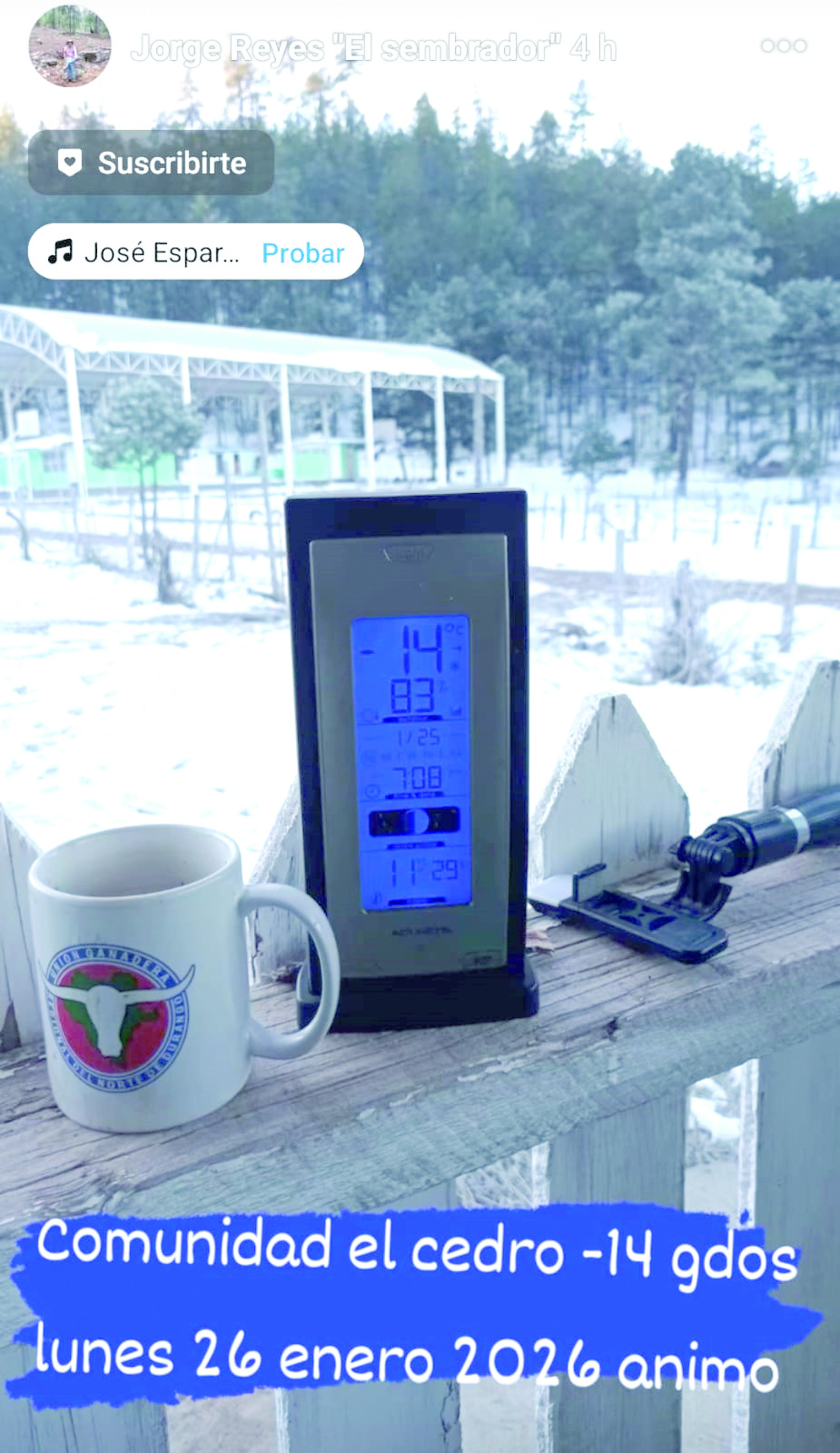 De acuerdo con el reporte emitido por el Departamento de Meteorología e Hidrología de la Comisión Nacional del Agua (Conagua) en Durango, en La Rosilla se registraron menos 15 grados. Un poco más abajo de ese poblado, en El Cedro, la temperatura alcanzó los 14 bajo cero de acuerdo a lo reportado en redes por Jorge Reyes, el "Sembrador de la Sierra".
