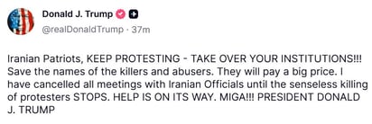 A través de su red social Truth Social, Trump llamó a los ciudadanos iraníes a continuar con las protestas y a tomar el control de sus instituciones. También pidió documentar a los responsables de los abusos.