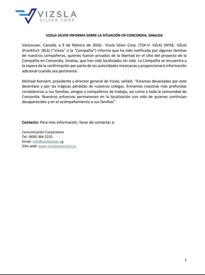 Tras conocerse la información, la minera canadiense a la que pertenecían, Vizsla Silver Corp, emitió un comunicado sobre la situación.