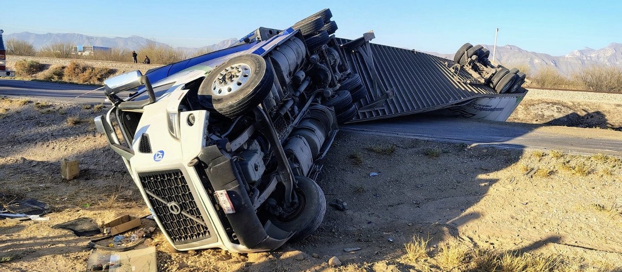La mañana de este lunes se registró la volcadura de un tráiler cargado con vitropiso en plena carretera Gómez Palacio-Jiménez; el conductor del camión resultó lesionado. El accidente ocurrió cerca de las 07:15 horas sobre los carriles de circulación de norte a sur, en el tramo ubicado entre los ejidos Brittingham y Dinamita.