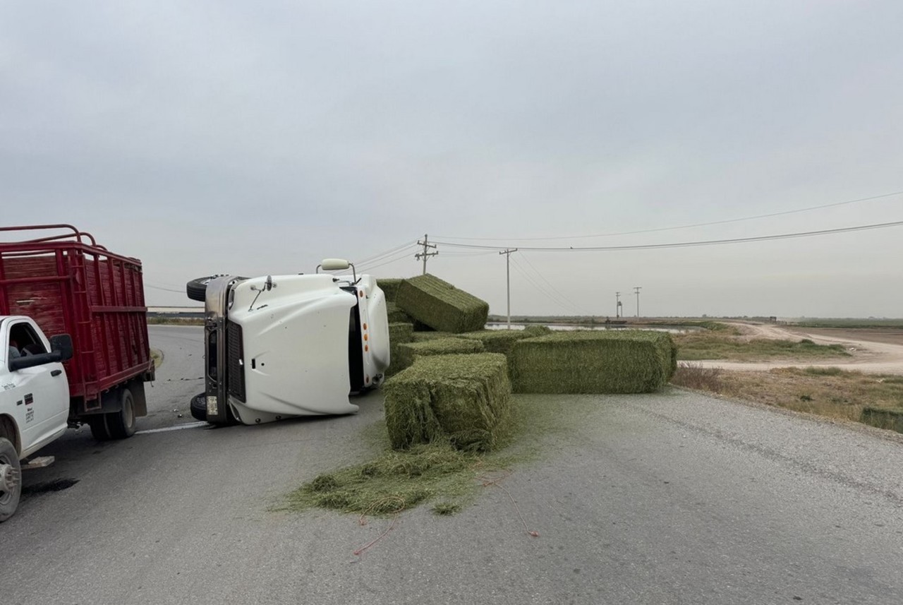 Un tráiler cargado con pacas de alimento para ganado sufrió una volcadura en la zona rural del municipio de Gómez Palacio; el chofer resultó ileso.